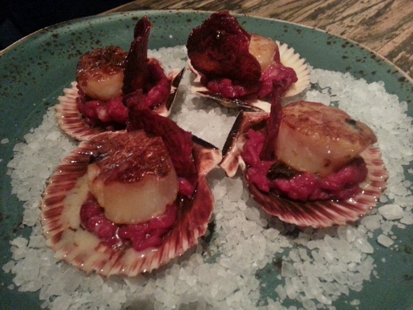 Nothing about the restaurant, however, is more striking than its new menu items - which should fit happily for diners around the beloved churrasco and the family’s category-creating tres leches. Pictured at the very top, for instance, is one of several versions of arepa, orginially a kind of street-food griddled corncake proudly claimed by Venezuela and Colombia but here almost a personal pizza. The version pictured is even called a margherita, to be make that point. And I love these new “popcorn scallops” atop beet risotto, drizzled with popcorn espuma and given crunch by beet chips.